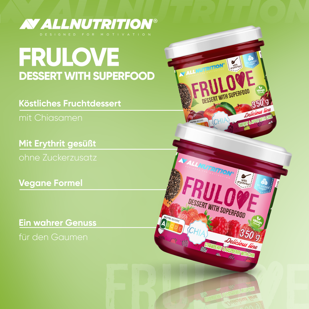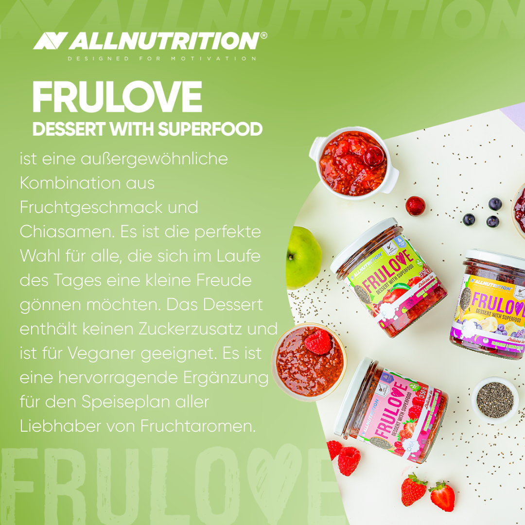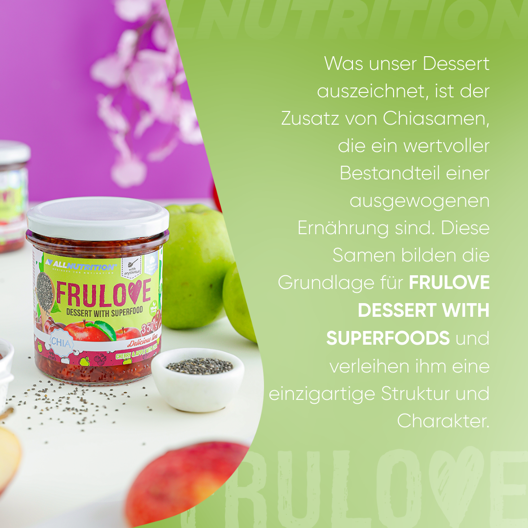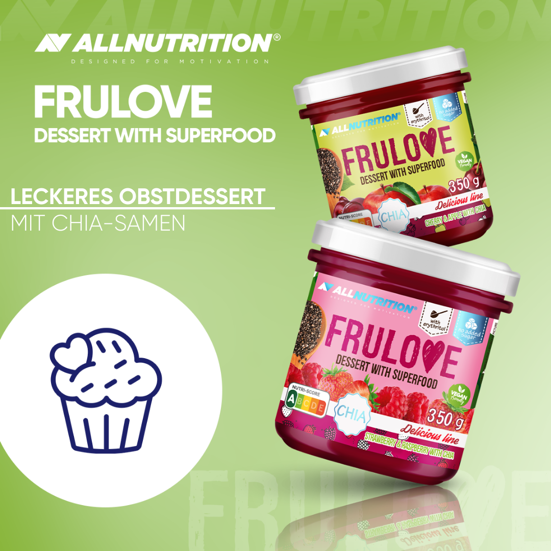 ALLNUTRITION FRULOVE DESSERT WITH SUPERFOODS ist eine außergewöhnliche Kombination aus fruchtigem Geschmack und Chiasamen. Die perfekte Wahl für alle, die sich im Alltag einen kleinen Genussmoment gönnen möchten. Das Dessert enthält keinen zugesetzten Zucker und ist für Veganer geeignet – eine ideale Ergänzung für jeden Liebhaber fruchtiger Aromen.