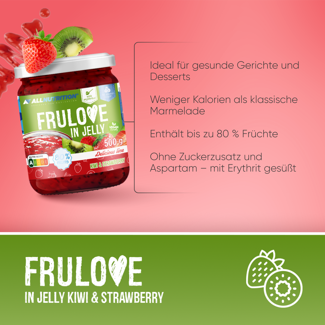 ALLNUTRITION FRULOVE IN JELLY KIWI & STRAWBERRY ist ein köstliches Fruchtgelee ohne Zuckerzusatz mit ganzen Fruchtstücken - bis zu 80 % Gehalt! Geschaffen für alle, die auf ihre Figur achten und dabei nicht auf ein wenig süßen Genuss in ihrer Ernährung verzichten wollen.