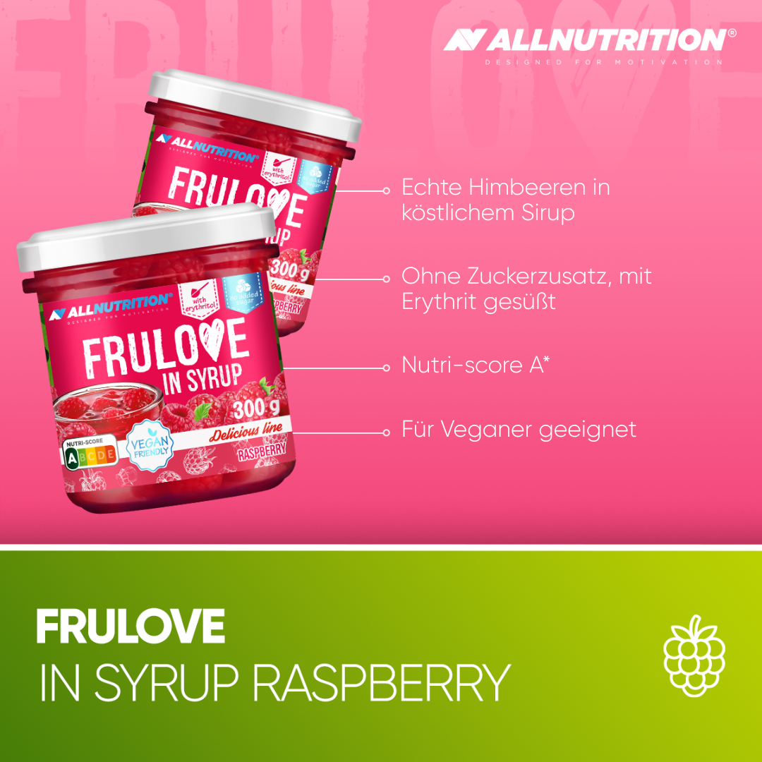 ALLNUTRITION FRULOVE IN SYRUP enthält köstliche Himbeeren in einem feinen, süßen Sirup, der dich mit seiner Leichtigkeit und seinem intensiven Fruchtgeschmack begeistern wird. Ohne zugesetzten Zucker und mit Erythrit gesüßt – die ideale Wahl für alle, die auf ihre Figur achten, aber nicht auf süßen Fruchtgenuss verzichten möchten.