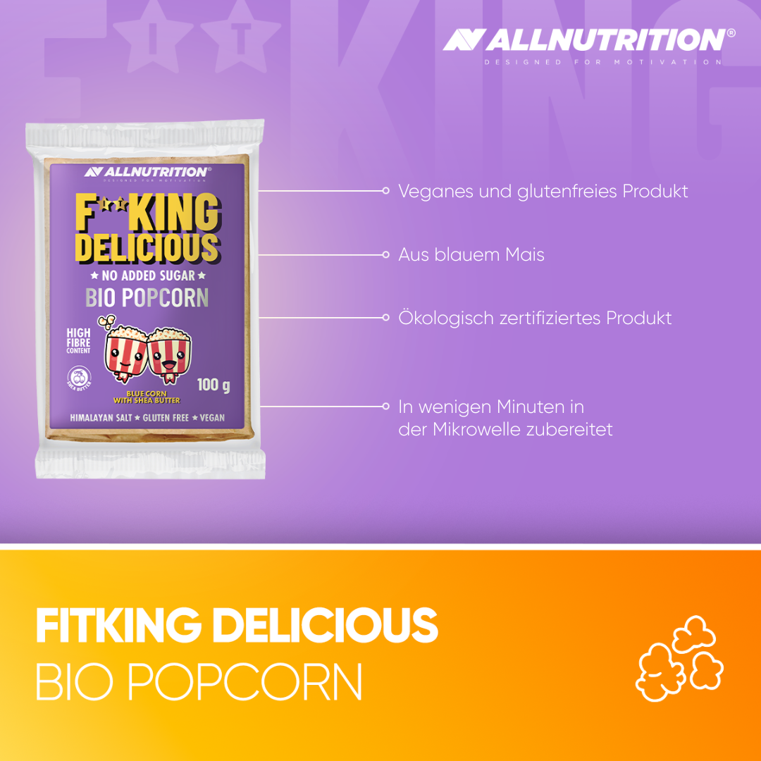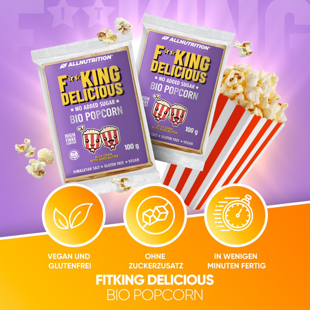 ALLNUTRITION FITKING DELICIOUS BIO POPCORN ist der perfekte salzige Snack für alle, die eine Alternative zu herkömmlichem Popcorn suchen. Hergestellt aus ökologischem blauem Mais, ohne zugesetzten Zucker – enthält nur natürlich vorkommende Zucker. Statt Palmöl verwenden wir Sheabutter! Eine schnelle und einfache Möglichkeit, köstliches Popcorn zuzubereiten – ideal für den Filmabend. Hoher Ballaststoffgehalt, vegane Formel und eine einfache Zutatenliste – genau das, was du brauchst!