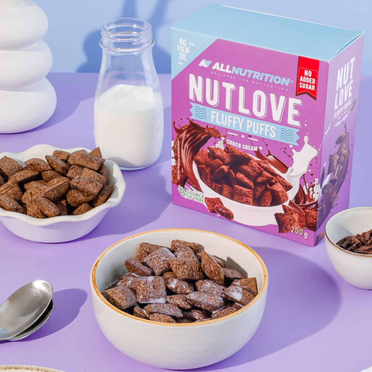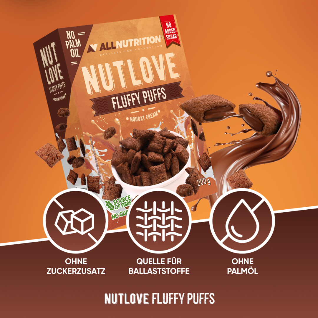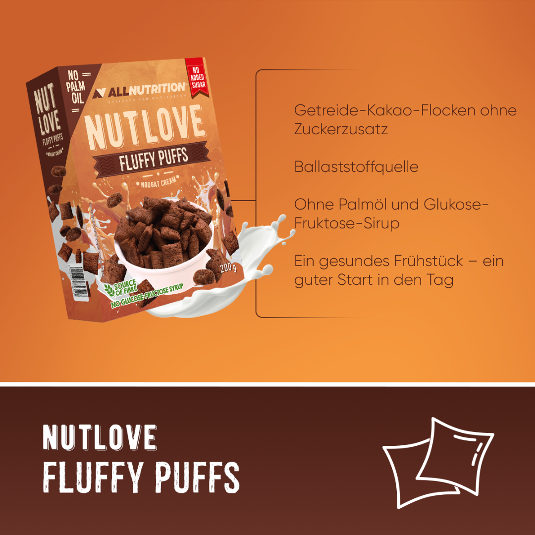 Lust auf etwas Knuspriges, Cremiges und absolut Leckeres? ALLNUTRITION NUTLOVE FLUFFY PUFFS sind Frühstücksflocken ohne Zuckerzusatz. Getreide-Kakaokissen mit zarter Füllung sind eine Quelle von Ballaststoffen und enthalten weder Palmöl noch Glukose-Fruktose-Sirup!